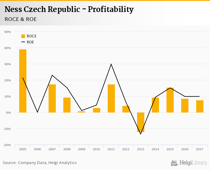 Ness Czech Republic made a net profit of CZK 25.1 mil in 2017, down 12.9% compared to the previous year. Historically, between 2005 and 2017, the company's net profit reached a high of CZK 84.6 mil in 2011 and a low of CZK -36.8 mil in 2013.