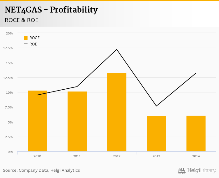 As far as NET4GAS's peers are concerned, RWE Transgas Czech Republic generated ROE of 3.94% and ROCE of 22.5% in 2014. CEZ's profitability reached 8.48% and 4.36%, respectively. CEPS operated with 4.80% and 4.28% returns in 2014.
