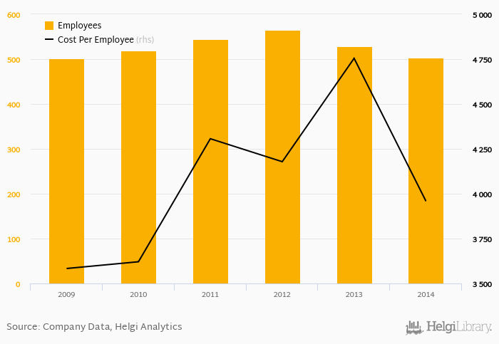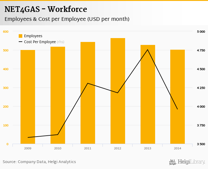 NET4GAS employed 503 employees in 2014, down 4.73% compared to the previous year. Historically, between 2009 and 2014, the firm's workforce hit a high of 565 employees in 2012 and a low of 502 employees in 2009.