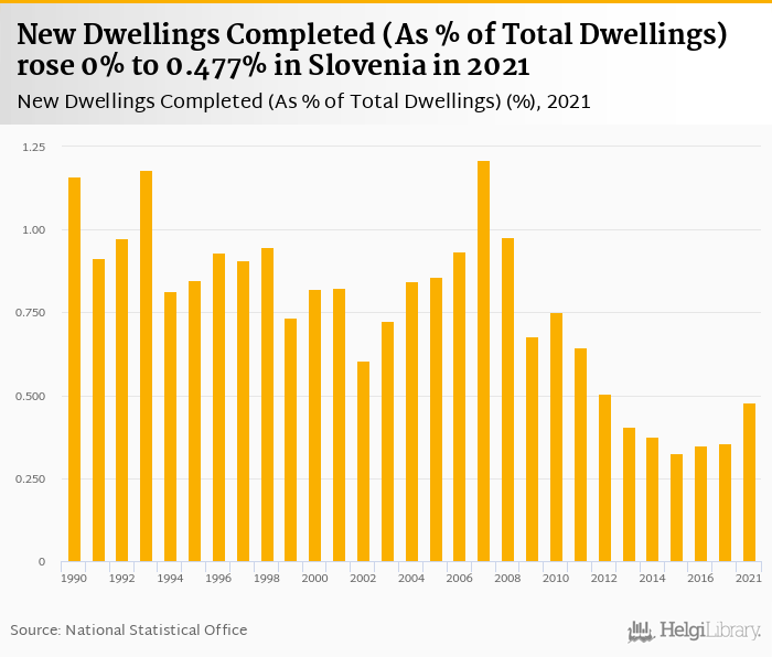 New dwellings completed as a percentage of total dwellings rose 0% to 0.477% in Slovenia in 2021, according to the National Statistical Office.