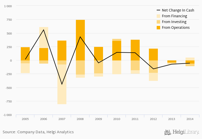Cash from financing amounted to EUR 52.2 mil, so the company generated EUR -55.4 mil net cash in 2014.