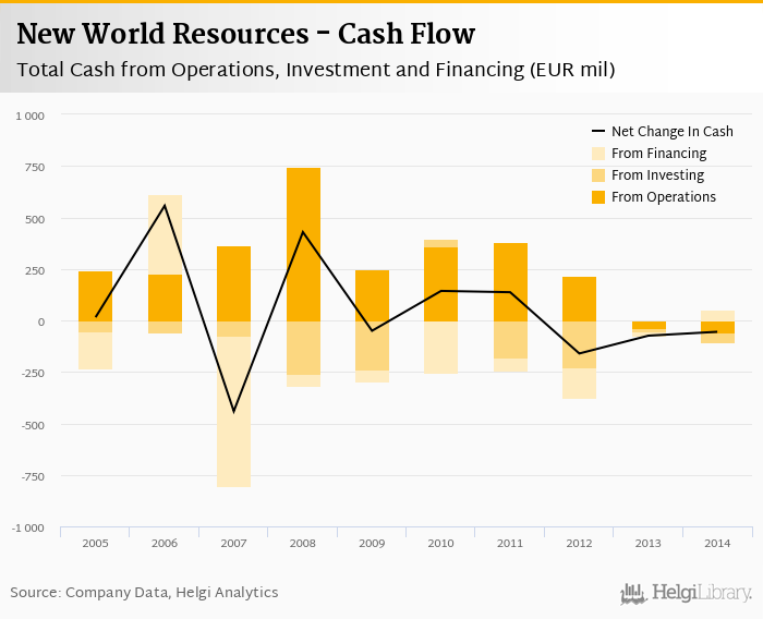 New World Resources's operating cash flow stood at EUR -56.3 mil in 2014, down 56.8% when compared to the previous year. Historically, between 2005 - 2014, the firm’s operating cash flow reached a high of EUR 746 mil in 2008 and a low of EUR -56.3 mil in 2014.