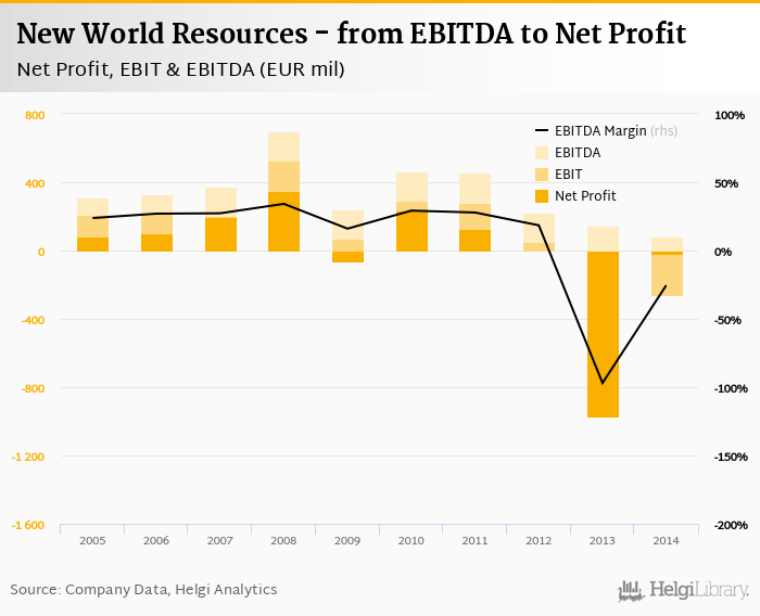New World Resources made a net profit of EUR -21.1 mil with revenues of EUR 676 mil in 2014, up by 97.8% and down by 20.5%, respectively, compared to the previous year. This translates into a net margin of -3.12%.