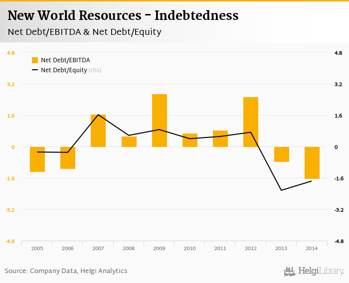 New World Resources's net debt stood at EUR 281 mil and accounted for -1.76 of equity at the end of 2014. The ratio is up 0.473 pp compared to the previous year.