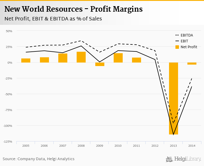 New World Resources made a net profit of EUR -21.1 mil with revenues of EUR 676 mil in 2014, up by 97.8% and down by 20.5%, respectively, compared to the previous year.