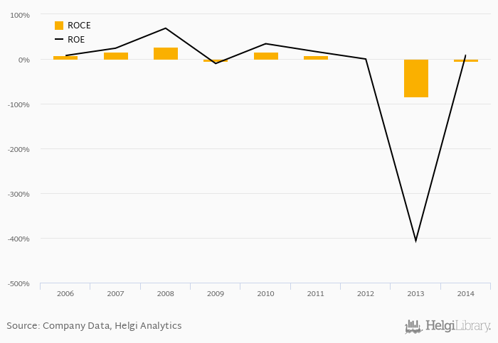 The result implies a return on equity of 9.58% and a return on invested capital of -4.65% in 2014. That is compared to an average of -69.2% and -12.8% over the last five years.