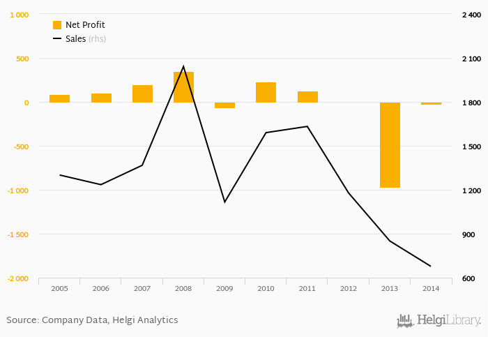 Sales have fallen by 4.83% a year on average since 2004. They reached a high of EUR 2,041 mil in 2008 and a low of EUR 676 mil in 2014.