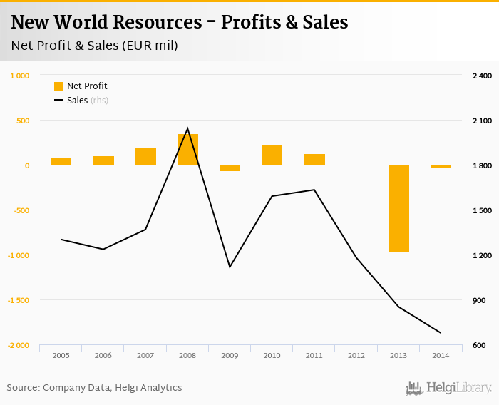 New World Resources made a net profit of EUR -21.1 mil in 2014, up 97.8% compared to the previous year. Total sales reached EUR 676 mil, which is down 20.5% when compared to the previous year.