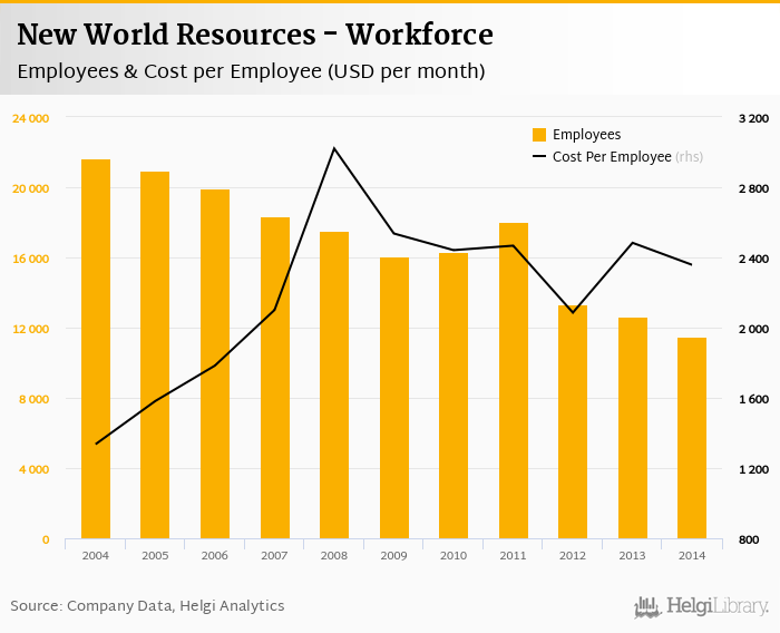 New World Resources employed 11,494 employees in 2014, down 8.83% compared to the previous year. Historically, between 2004 and 2014, the firm's workforce hit a high of 21,633 employees in 2004 and a low of 11,494 employees in 2014.