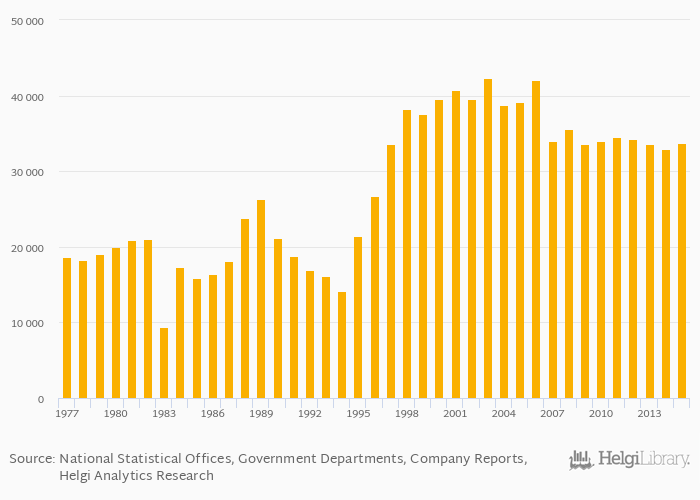 Historically, nickel (smelter/refined) production in Cuba reached an all time high of 42,300 tonnes in 2003 and an all time low of 9,342 tonnes in 1983.