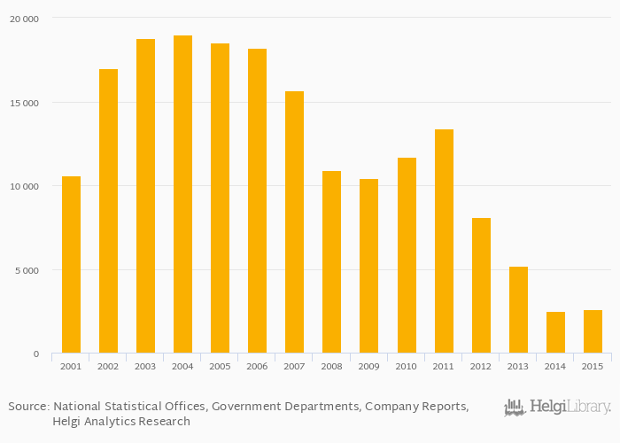 Historically, nickel (smelter/refined) production in Venezuela reached an all time high of 19,000 tonnes in 2004 and an all time low of 2,500 tonnes in 2014.