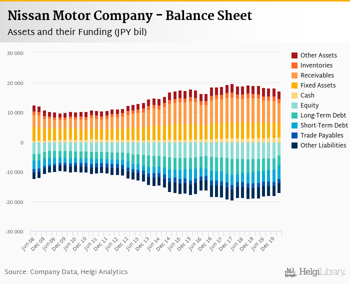 Nissan Motor Company's total assets reached JPY 16,977 bil at the end of 1Q2020, down 10.4% compared to the previous year.