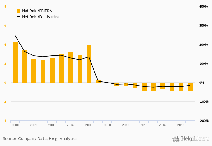 Net debt to EBITDA was calculated at -0.904x at the end of the year. That is down from -0.856x seen in 2014. The ratio reached a high of 4.21x in 2000 and a low of -0.934x in 2018.