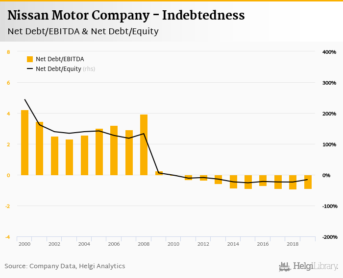 Nissan Motor Company's net debt stood at JPY -848 bil and accounted for -15.6% of equity at the end of 2019. The ratio is up 8.02 pp compared to the previous year.