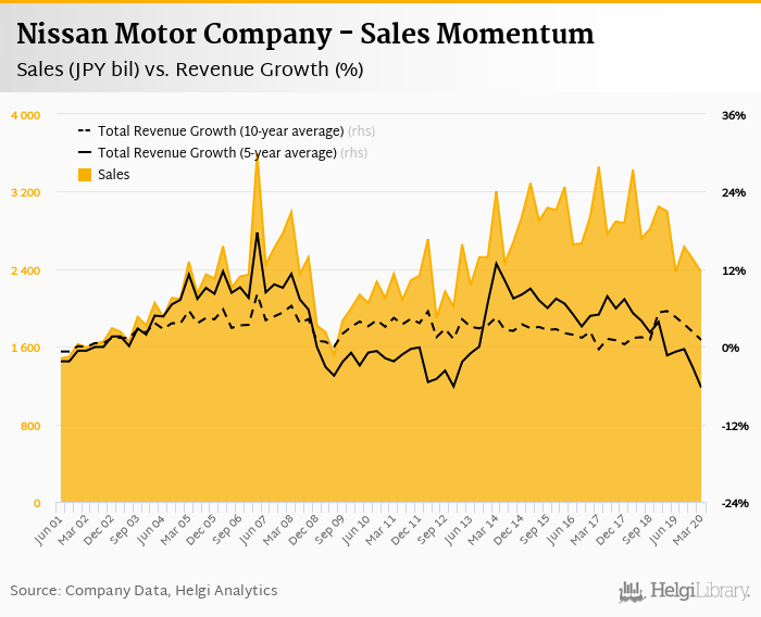 Nissan Motor Company generated sales of JPY 2,372 bil in 1Q2020, down 20.8% compared to the previous year. Historically, between 2Q1991 and 1Q2020, the company’s sales reached a high of JPY 3,591 bil in 1Q2007 and a low of JPY 1,431 bil in 1Q1994.