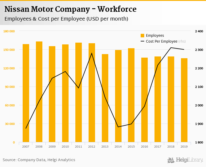 Nissan Motor Company employed 136,134 employees in 2019, down 1.99% compared to the previous year. Historically, between 1999 and 2019, the firm's workforce hit a high of 169,644 employees in 2004 and a low of 118,161 employees in 2001.