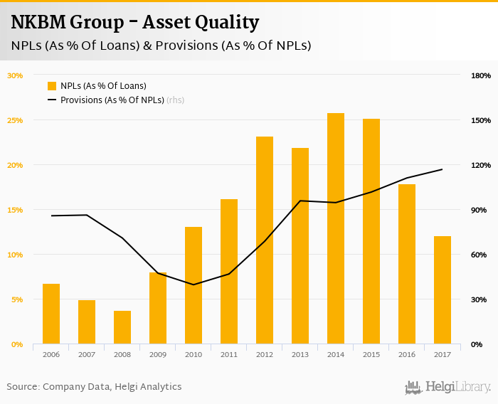 NKBM Group's non-performing loans reached 12.0% of total loans at the end of 2017, down from 17.9% compared to the previous year. Historically, the NPL ratio hit an all time high of 25.8% in 2014 and an all time low of 3.75% in 2008.