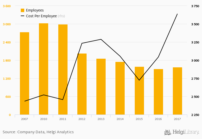 NKBM Group employed 1,576 persons in 2017, up 4.23% when compared to the previous year. Historically, the bank's workforce hit an all time high of 3,025 persons in 2010 and an all time low of 1,512 in 2016.