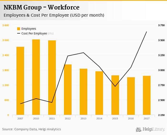 Comparing NKBM Group with its closest peers, UniCredit Bank Slovenia had 568 employees and 28.0 branches in 2017 and SKB Banka operated with 912 people and 55.0 branches.