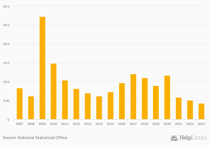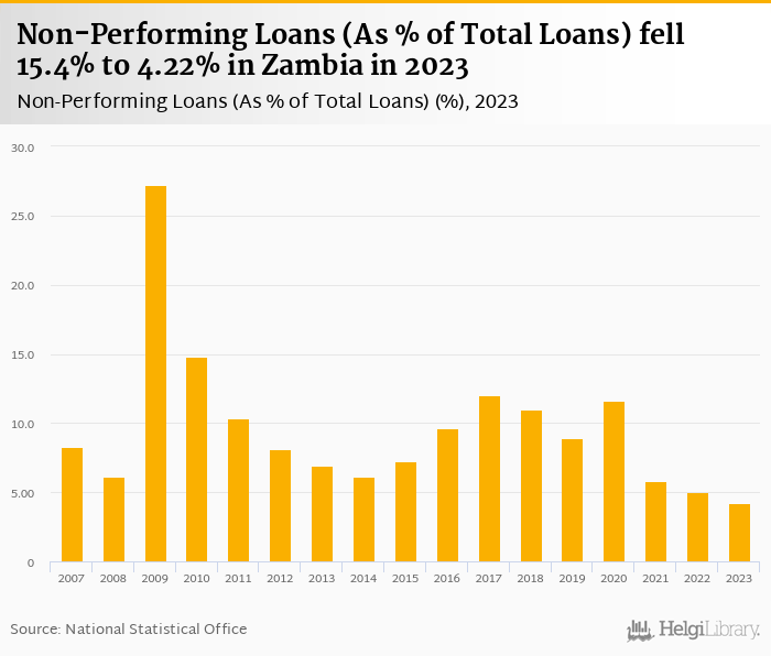 Historically, non-performing loans as a share of bank loans in Zambia reached an all time high of 27.2% in 2009 and an all time low of 4.22% in 2023.