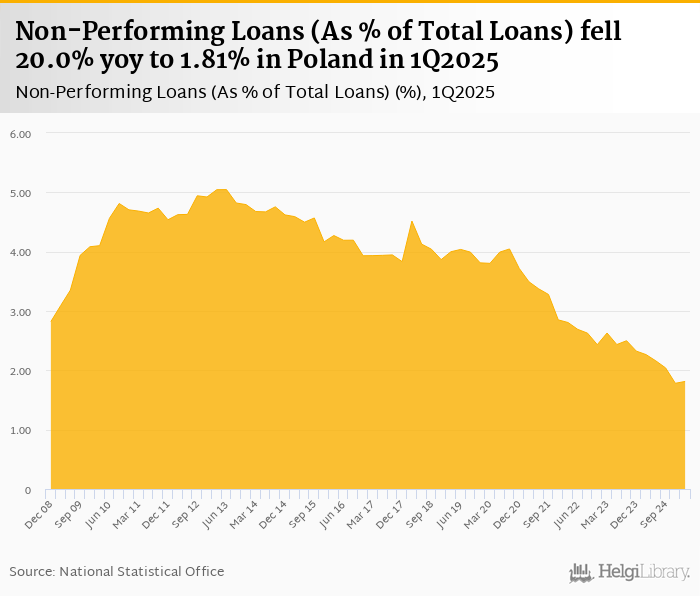 Non-performing loans as a share of bank loans fell 20.0% yoy to 1.81% in Poland in 1Q2025, according to the National Central Bank. This is 1.75% more than in the previous quarter.