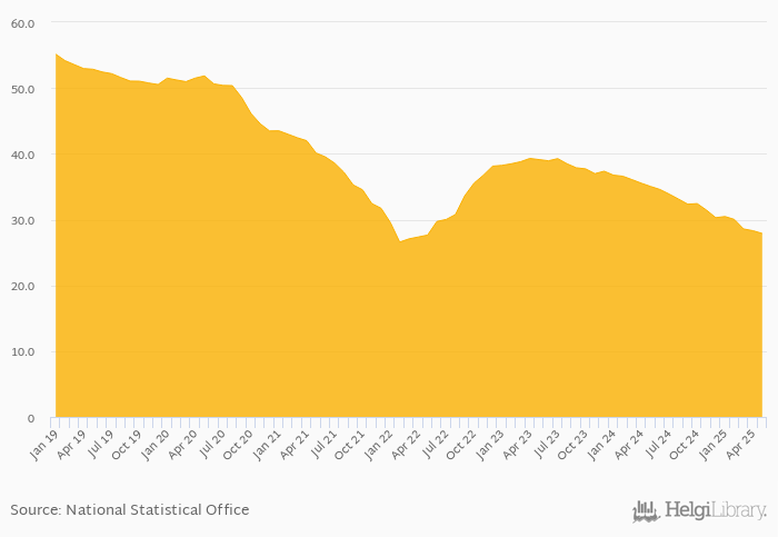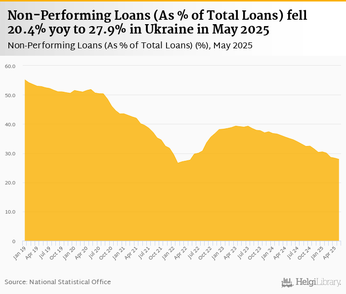 Non-performing loans as a share of bank loans fell 20.4% yoy to 27.9% in Ukraine in May 2025, according to the National Central Bank. This is 1.46% less than in the previous month.