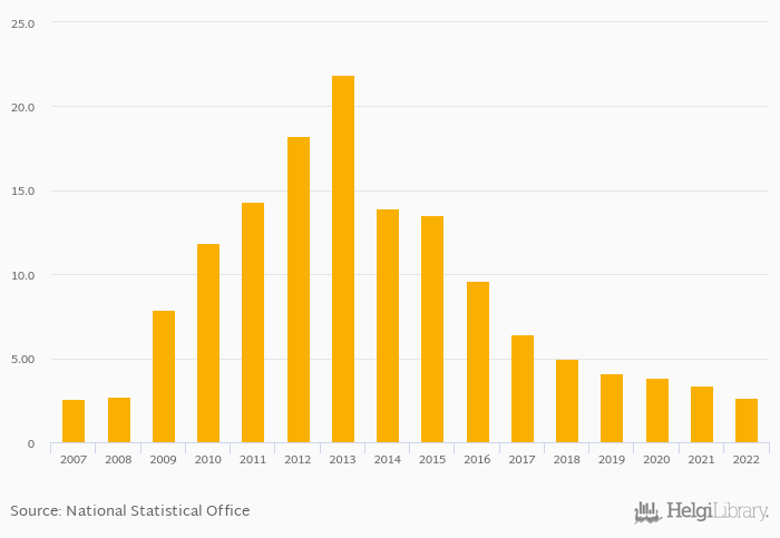 Historically, non-performing loans as a share of bank loans in Romania reached an all time high of 21.9% in 2013 and an all time low of 2.59% in 2007. When compared to Romania's main peers, non-performing loans as a share of bank loans in Bulgaria amounted to 4.53%, 3.79% in Hungary, 6.44% in Moldova and 38.1% in Ukraine in 2022.