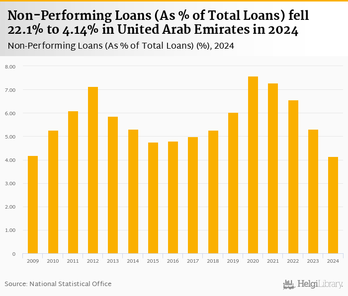 Non-performing loans as a share of bank loans fell 22.1% to 4.14% in United Arab Emirates in 2024, according to the National Central Bank.