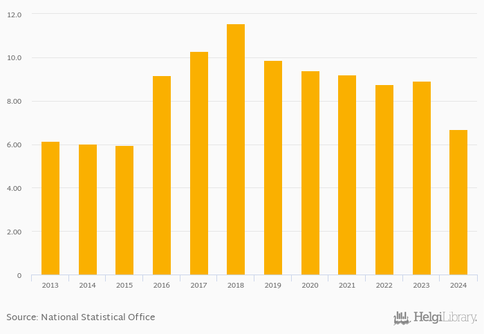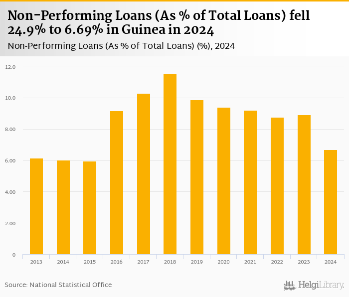 Non-performing loans as a share of bank loans fell 24.9% to 6.69% in Guinea in 2024, according to the National Central Bank.