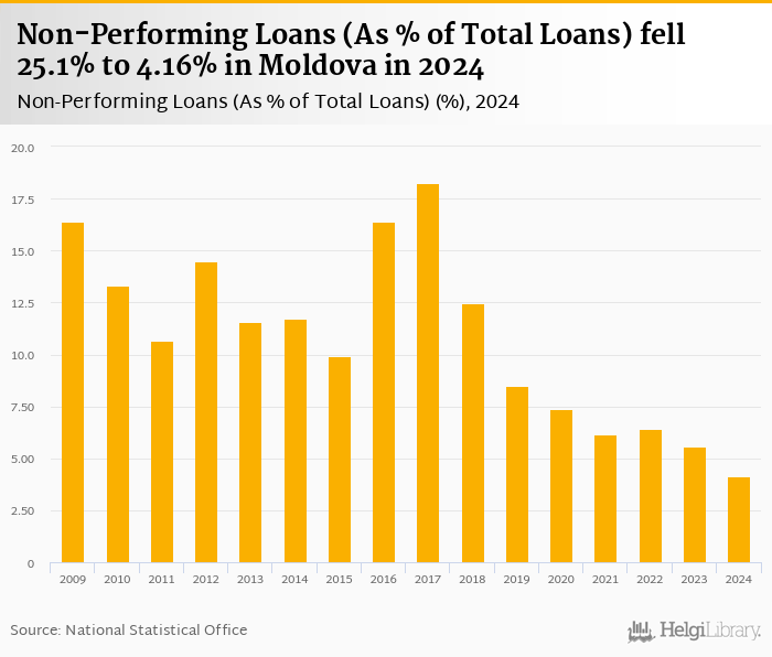 Non-performing loans as a share of bank loans fell 25.1% to 4.16% in Moldova in 2024, according to the National Central Bank.