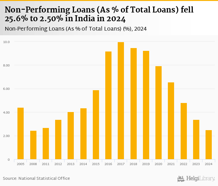 Non-performing loans as a share of bank loans fell 25.6% to 2.50% in India in 2024, according to the National Central Bank.