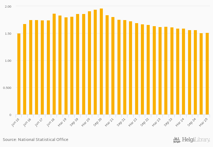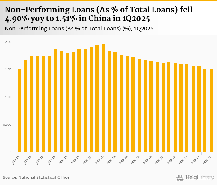 Non-performing loans as a share of bank loans fell 4.90% yoy to 1.51% in China in 1Q2025, according to the National Central Bank. This is 0.583% more than in the previous quarter.