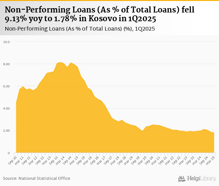 Non-performing loans as a share of bank loans fell 9.13% yoy to 1.78% in Kosovo in 1Q2025, according to the National Central Bank. This is 4.26% less than in the previous quarter.