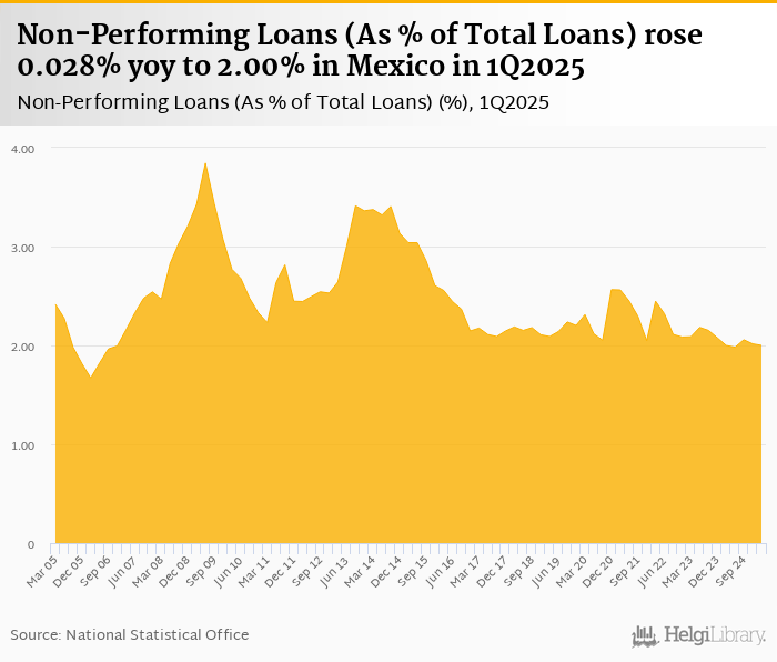 Non-performing loans as a share of bank loans rose 0.028% yoy to 2.00% in Mexico in 1Q2025, according to the National Central Bank. This is 0.767% less than in the previous quarter.