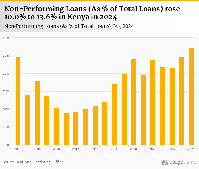 Non-performing loans as a share of bank loans rose 10.0% to 13.6% in Kenya in 2024, according to the National Central Bank.