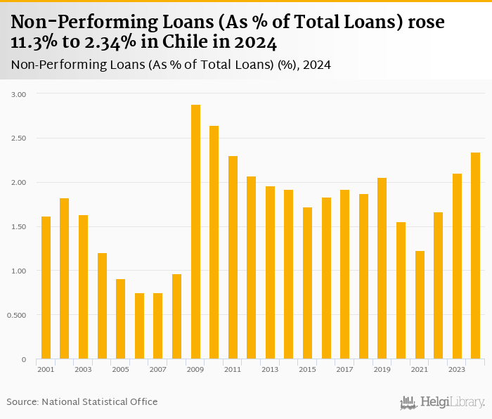 Non-performing loans as a share of bank loans rose 11.3% to 2.34% in Chile in 2024, according to the National Central Bank.