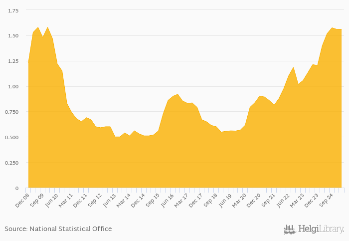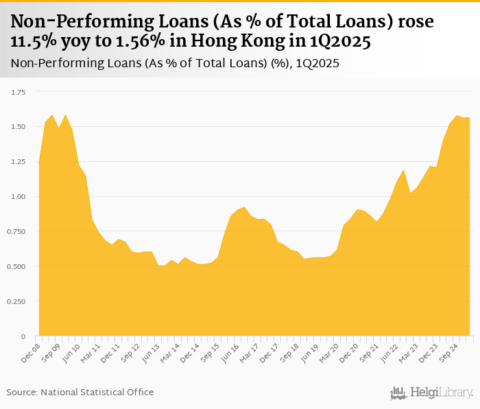 Non-performing loans as a share of bank loans rose 11.5% yoy to 1.56% in Hong Kong in 1Q2025, according to the National Central Bank. This is 0.056% more than in the previous quarter.