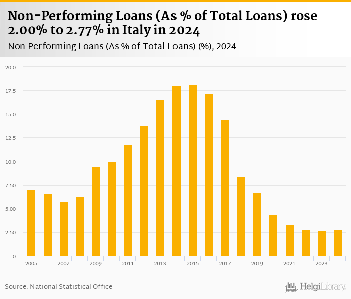 Non-performing loans as a share of bank loans rose 2.00% to 2.77% in Italy in 2024, according to the National Central Bank.