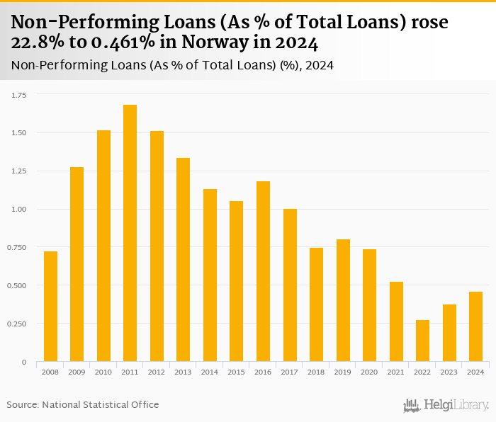 Non-performing loans as a share of bank loans rose 22.8% to 0.461% in Norway in 2024, according to the National Central Bank.