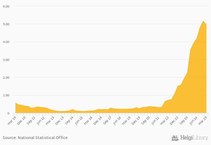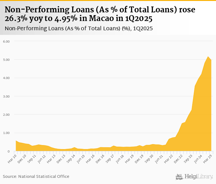 Non-performing loans as a share of bank loans rose 26.3% yoy to 4.95% in Macao in 1Q2025, according to the National Central Bank. This is 3.93% less than in the previous quarter.