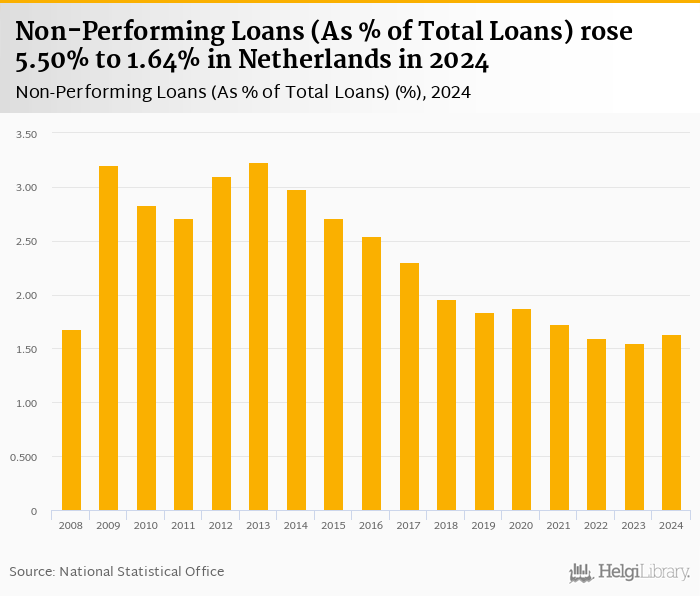 Non-performing loans as a share of bank loans rose 5.50% to 1.64% in Netherlands in 2024, according to the National Central Bank.