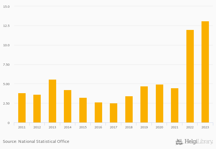 Historically, non-performing loans as a share of bank loans in Sri Lanka reached an all time high of 13.1% in 2023 and an all time low of 2.50% in 2017.