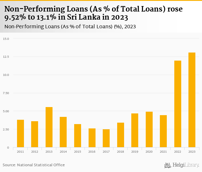 Non-performing loans as a share of bank loans rose 9.52% to 13.1% in Sri Lanka in 2023, according to the National Central Bank.