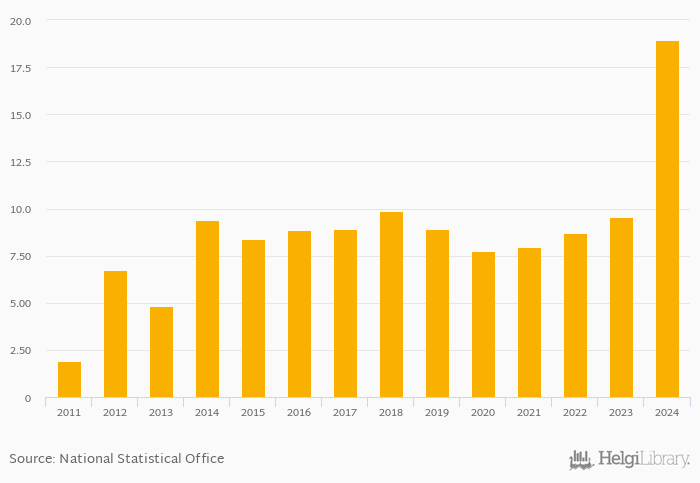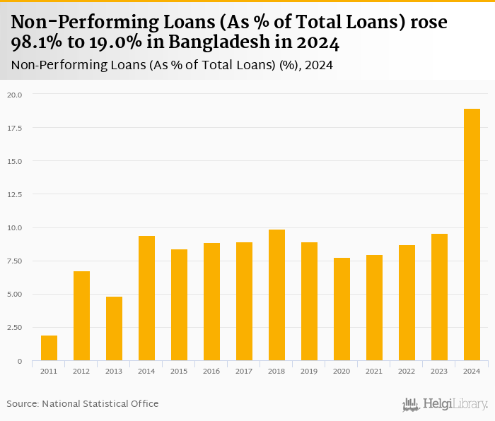 Non-performing loans as a share of bank loans rose 98.1% to 19.0% in Bangladesh in 2024, according to the National Central Bank.