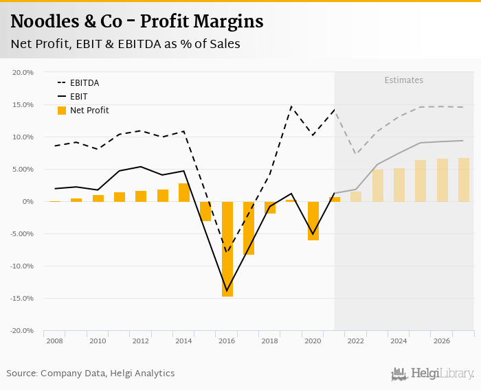 Noodles & Co made a net profit of USD 3.67 mil with revenues of USD 475 mil in 2021, up by 116% and up by 20.7%, respectively, compared to the previous year.