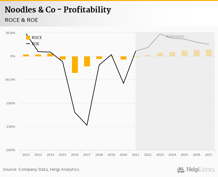 Noodles & Co made a net profit of USD 3.67 mil in 2021, up 116% compared to the previous year. Historically, between 2008 and 2021, the company's net profit reached a high of USD 11.4 mil in 2014 and a low of USD -71.7 mil in 2016.