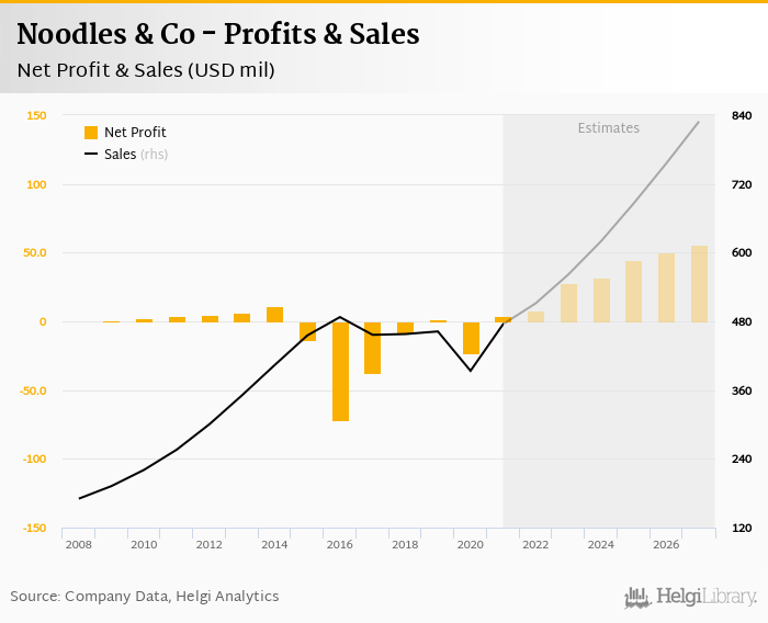 Noodles & Co made a net profit of USD 3.67 mil in 2021, up 116% compared to the previous year. Total sales reached USD 475 mil, which is up 20.7% when compared to the previous year.
