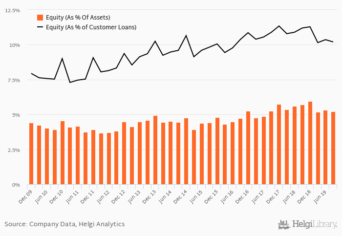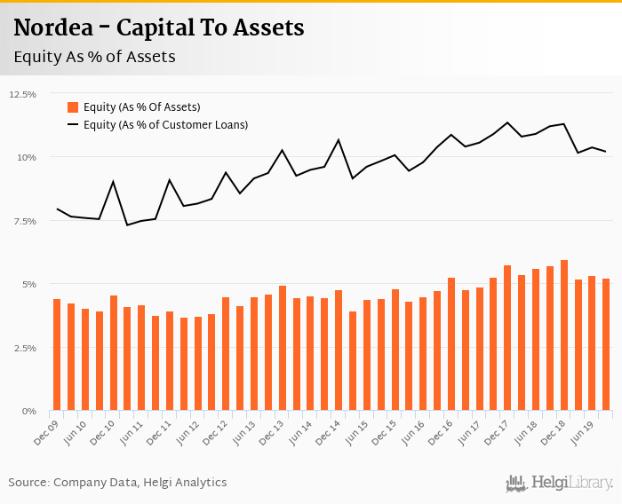 Nordea's Equity reached 7.25% of total assets in the 3Q2019, down from 7.42% for the previous year. As a share of net customer loans, the ratio amounted to 19.4% at the end of the third quarter of 2019.