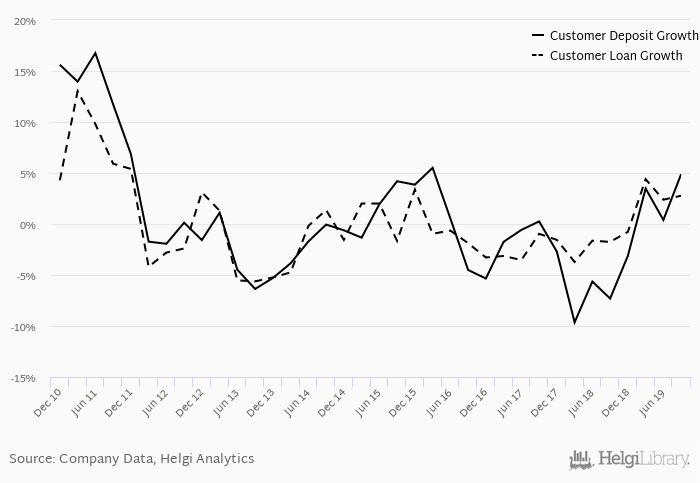On the other hand, bank's customer deposit growth amounted to 4.88% at the end of 2019-09-30, up from -7.31% when compared to the previous year. Historically, the bank’s deposit growth reached an all time high of 16.8% in 2011-06-30 and an all time low of -9.64% in 2018-03-31. In the last decade, the average annual loan growth amounted to 0%.