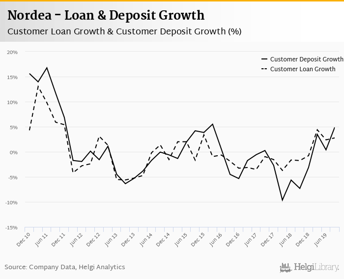 Nordea's customer loan growth reached 2.77% in 2019-09-30, up from -1.76% compared to the previous year. Historically, the bank’s loans growth reached an all time high of 13.0% in 2011-03-31 and an all time low of -5.63% in 2013-09-30. In the last decade, the average annual loan growth amounted to 0%.